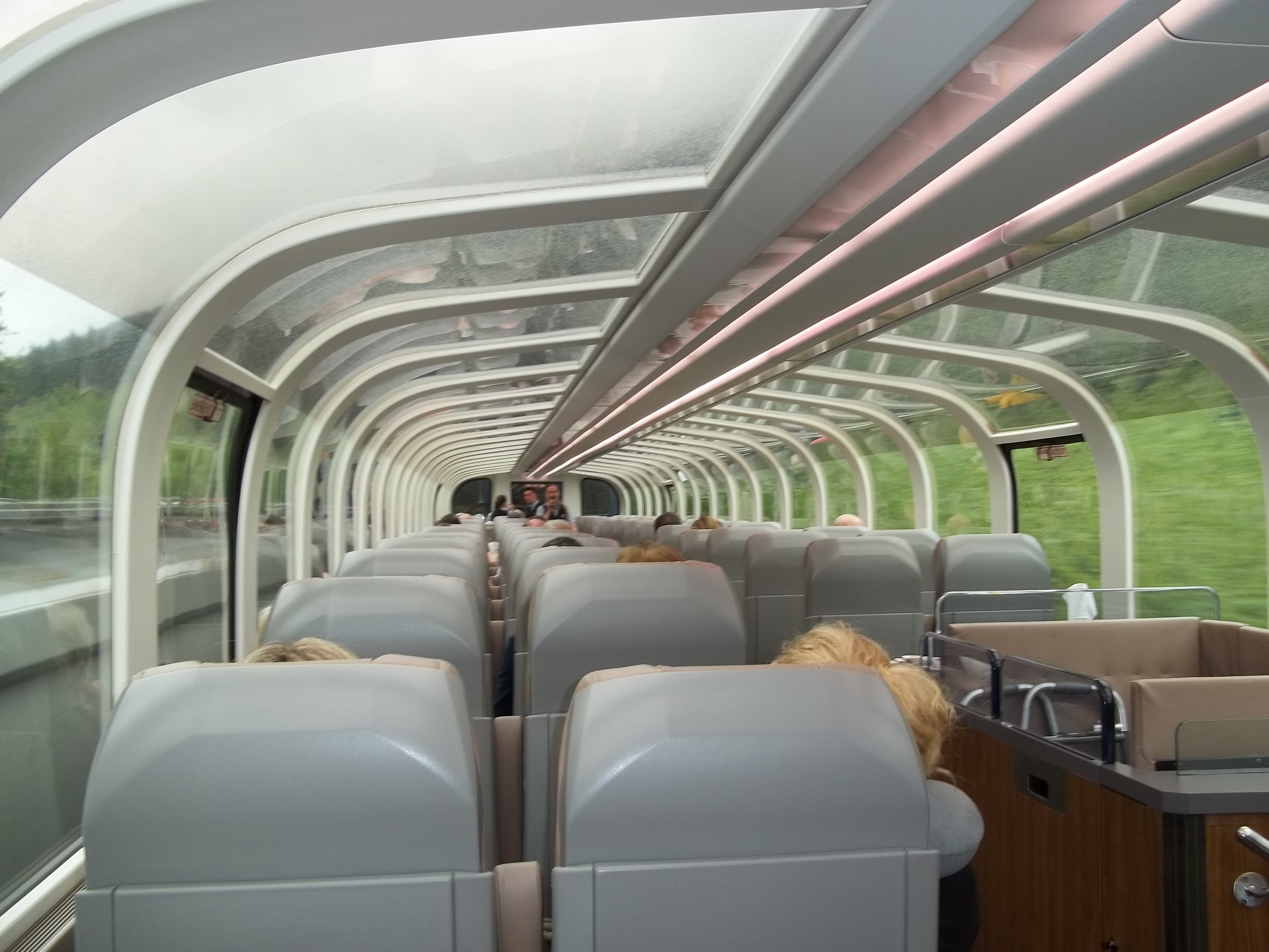 2e jour ( Banff Kamloops) on part tôt pour se rendre au train départ de Banff pour Kamloops, paysage merveilleux, toujours à surveiller les rivières, lacs et montagnes et nous avons voyagé en catégorie Goldleaf , cela vaut vraiment le supplément d` environ 300$ par jour (2 jours de train), nous avions un toit vitré et le wagon est surélevé ce qui procure une bien meilleure vue à l’étage . Au 1er, il y a la cuisine où nous pouvons manger des repas de très grande qualité et à l’arrière un grand balcon idéal pour sentir la nature et surtout pour prendre des photographies, sans parler de se dégourdir les jambes, car le voyage est d` une durée minimum d’environ 12 heures, les boissons et des goûters sont offerts à volonté, pour mieux apprécier et comprendre, des explications sont données régulièrement via des haut-parleurs, mais en anglais seulement, mais si vous le précisez en avance un petit journal de bord vous est offert en français qui explique le parcours et l’histoire.